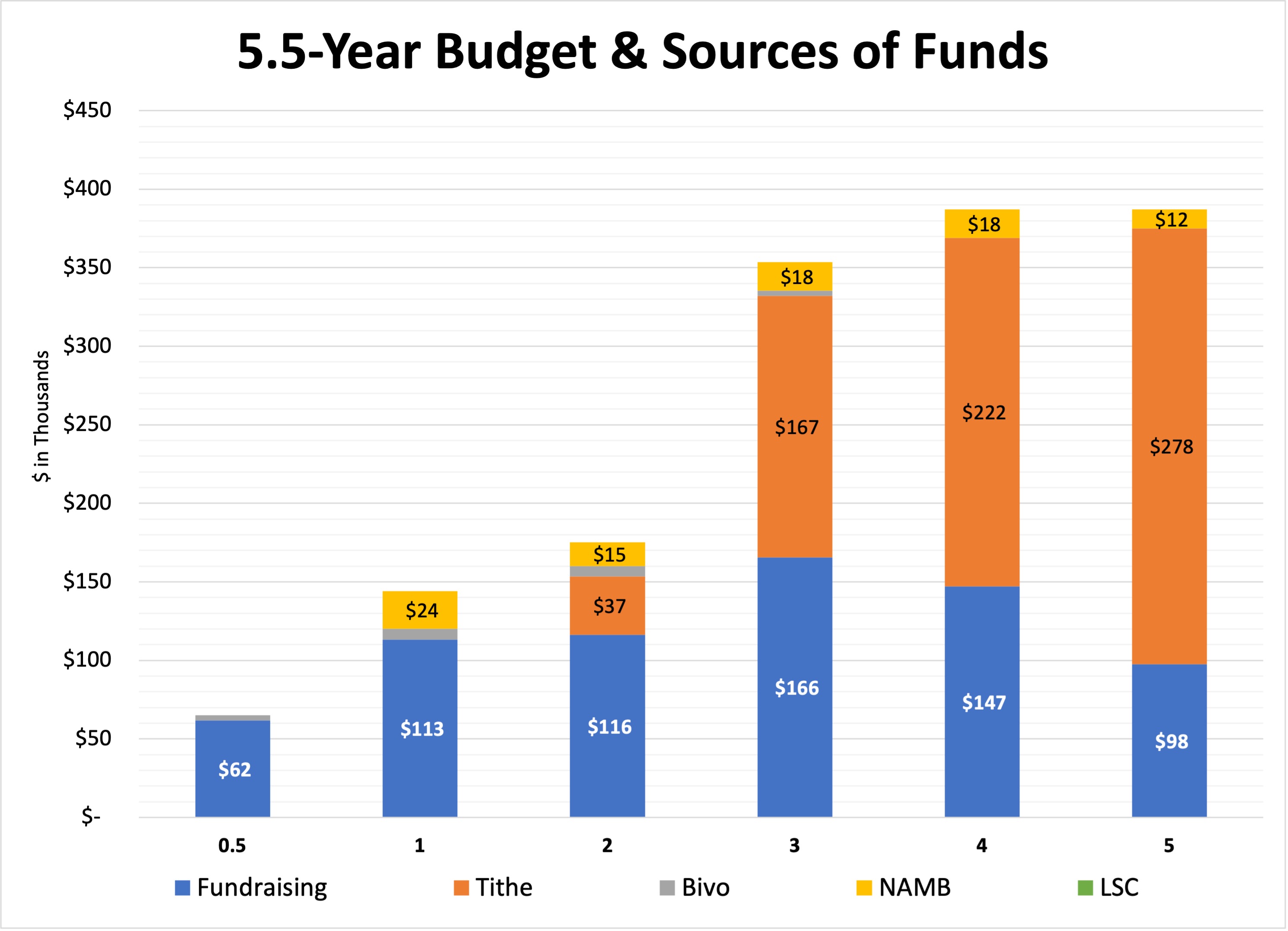 The blue columns represent the amount we need to fundraise each year. The yellow, orange, gray, and green columns represent the amount we will receive from other sources of funding, including NAMB, tithes from our church plant, bi-vocational work, and our local sending church.